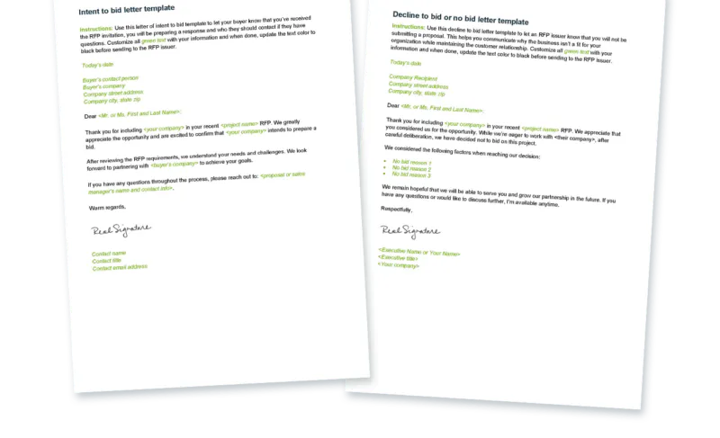 Now, you have your decision. What’s next? If the opportunity is a great fit, you’re good to go! Use an intent to bid letter to share the news with your buyer. Then move forward to the next step in your proposal timeline. Conversely, if you don’t plan to bid, you should notify the customer of your decision. Either way, we’ve got you covered.