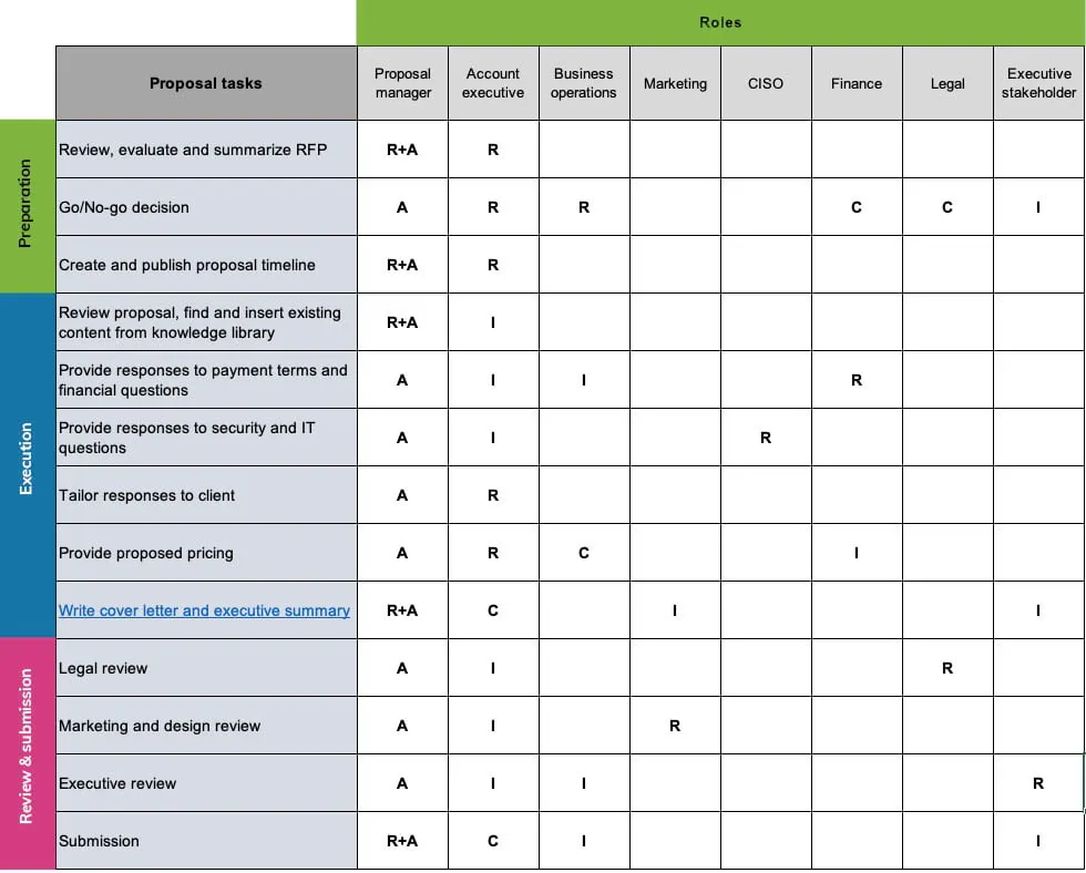 A RACI matrix defines the tasks, team members and responsibilities involved in your proposal process using a chart format. Tasks appear on one axis of the chart, while team members are listed on the other. The chart then fills in who is who is Responsible, who is Accountable, who is Consulted and who is Informed for each step. Because the information is clearly displayed, it’s a quick way to get everyone on the same page.