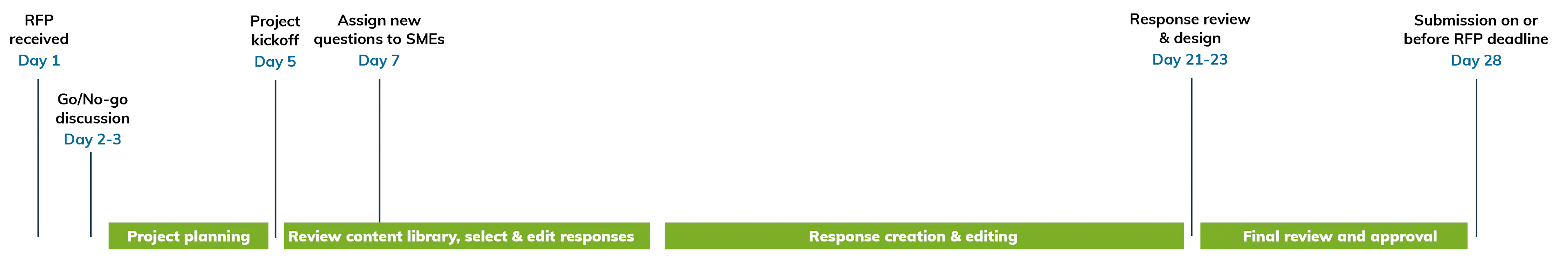 Next, the visual aspect of the RACI matrix and the detailed nature of a project implementation plan approaches come together in a proposal timeline. This method uses a visual timeline to provide an overview of the RFP response process.